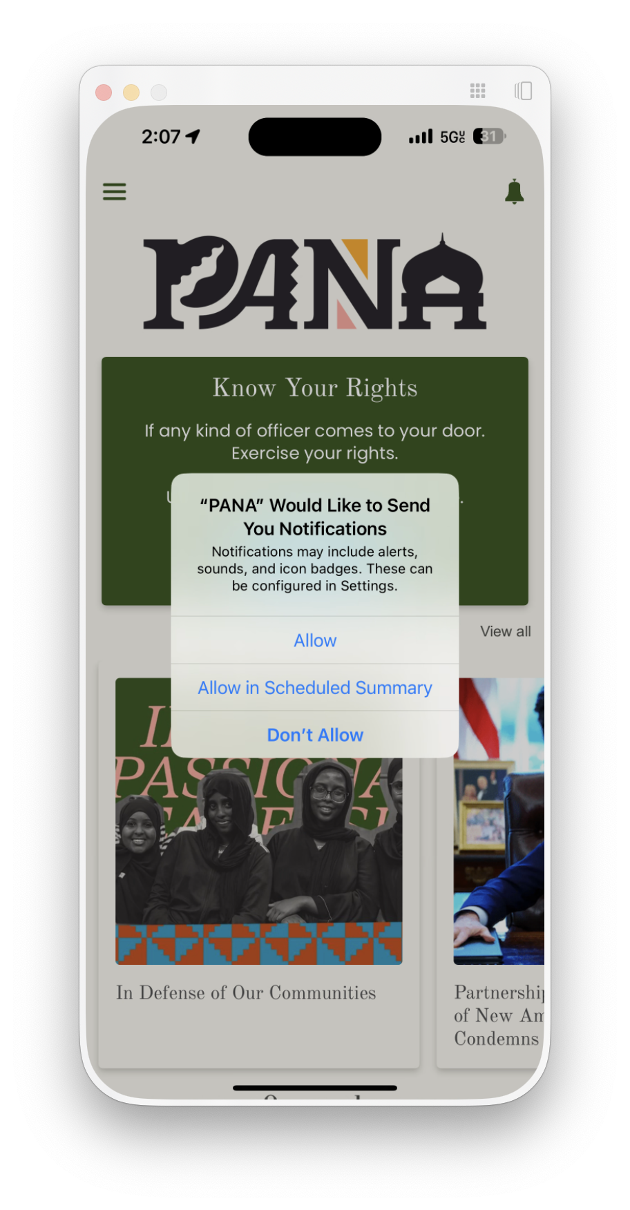 Download and install our new mobile app. Stay up to date on our partnership, Know Your Rights, and share your photos and videos with PANA.