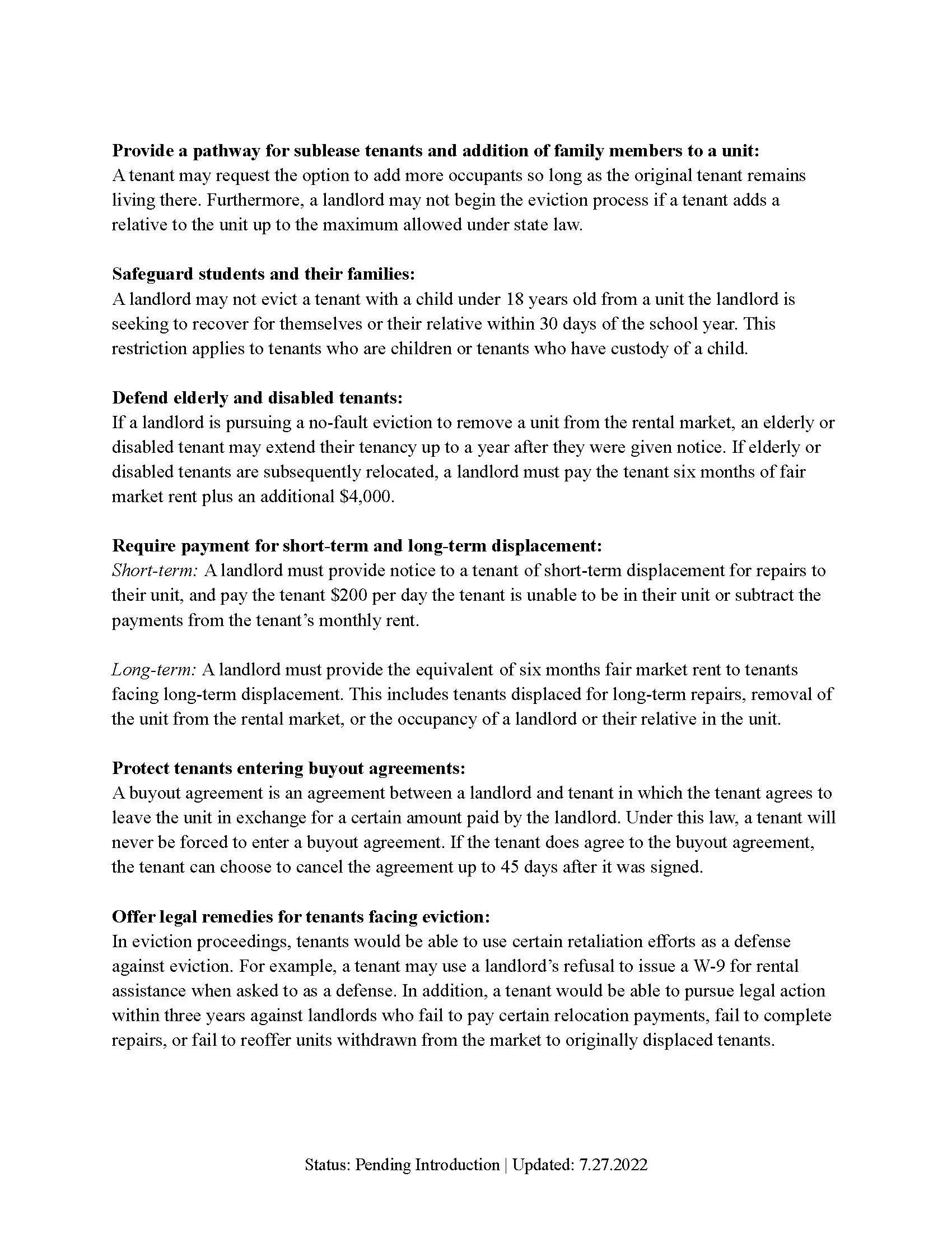 Our proposed Tenant Protections Ordinance would expand current protections in place for tenants and close loopholes by placing limits on landlords who are wrongfully evicting tenants within the City of San Diego. The updated law will provide robust protections for renters, close loopholes that landlords use to wrongfully evict families, and provide relocation assistance to renter families who have done everything right and still face eviction of no fault of their own.